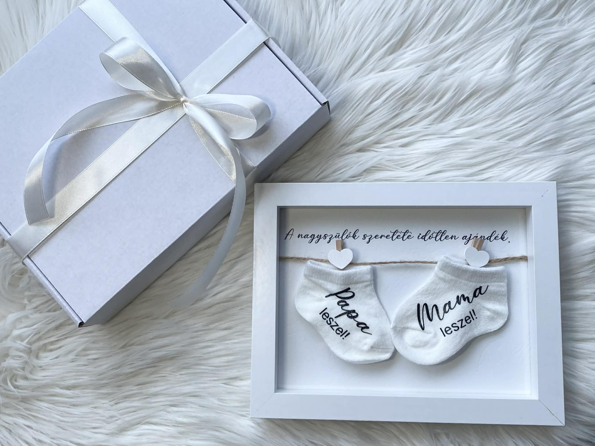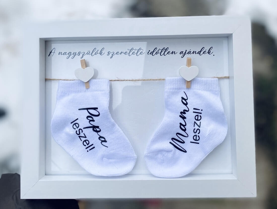 Az aprócska kis zoknik egy 3D-s képkeretben, üzenettel, szivecskés csipesszel felfüggesztve, ami bejelentés után örök emlék lesz, érdemes maradandó ajándékkal bejelenteni ezt a hírt!