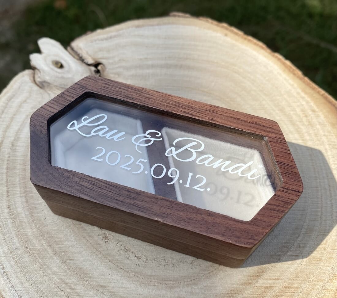 Fa gyűrűtartó doboz a menyasszony és a vőlegény nevével feliratozva, dátummal és vagy monogrammal rendelhető