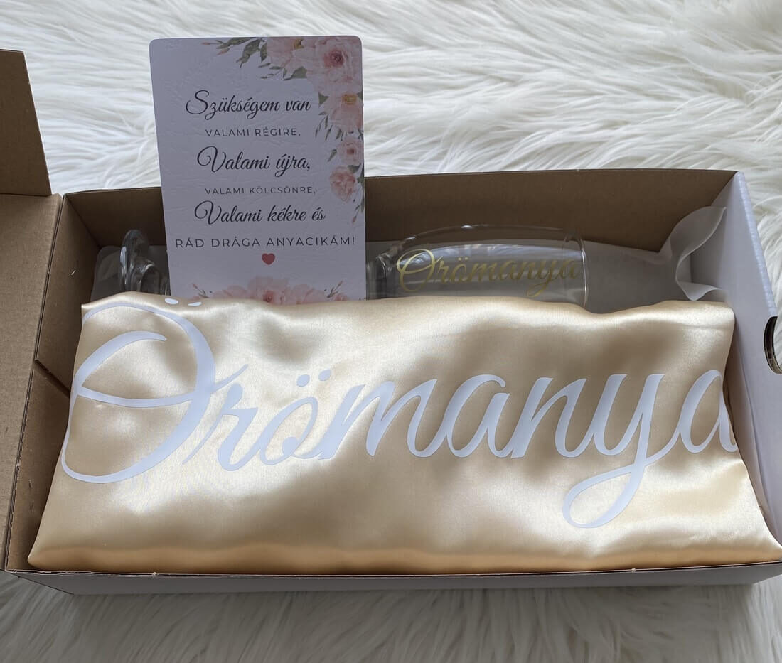 - 1 db pezsgős pohár névvel vagy Örömanya felirattal