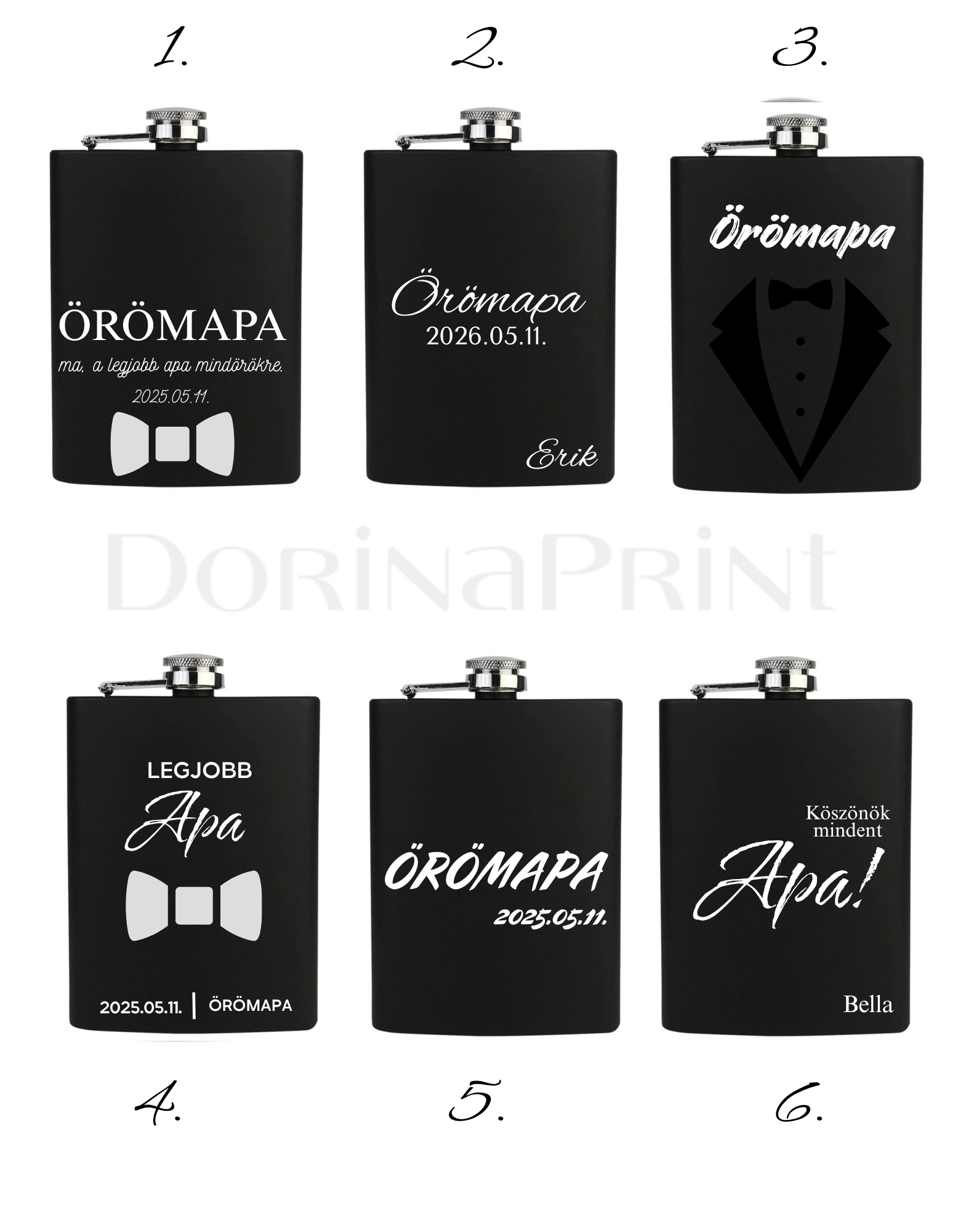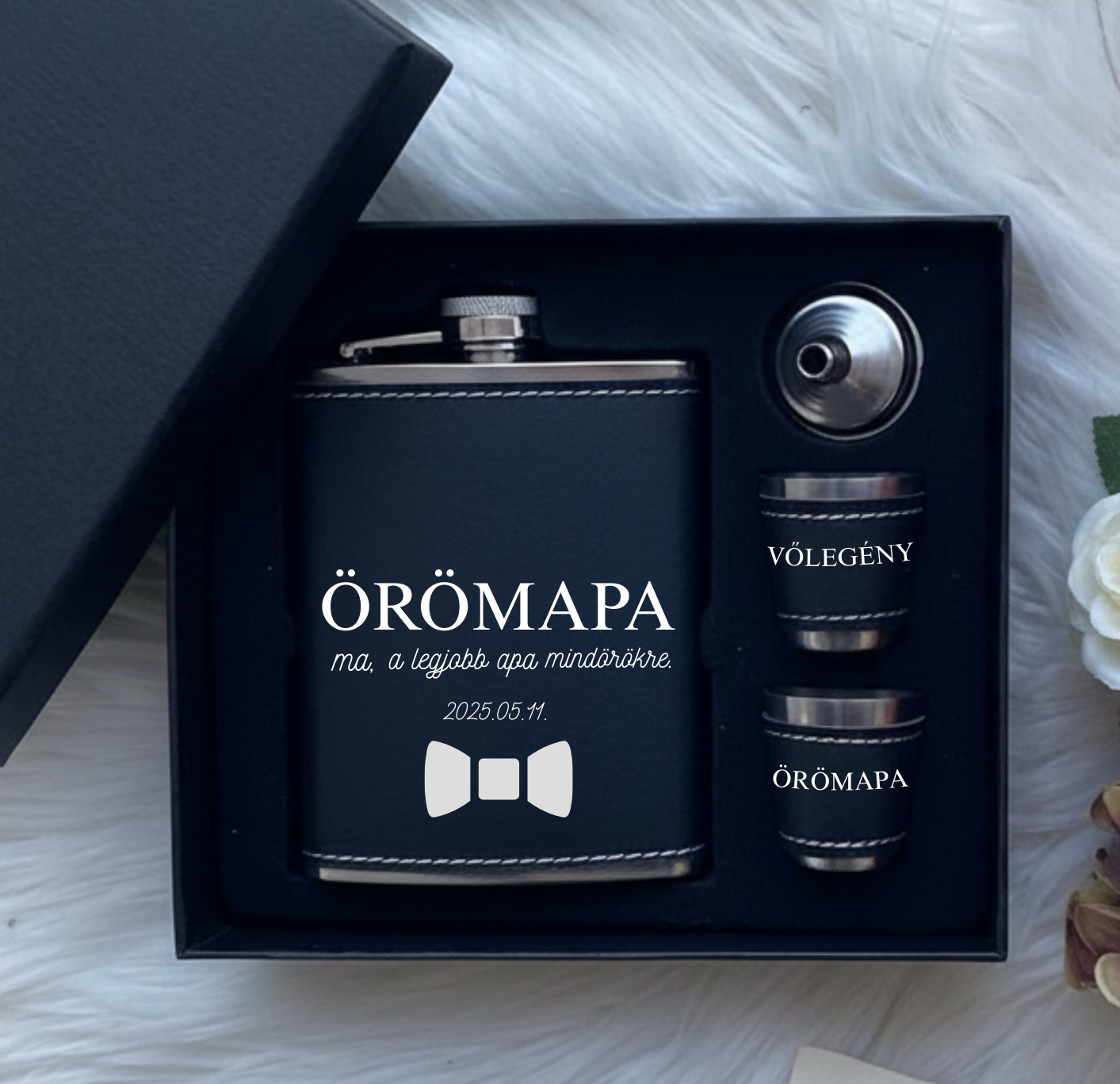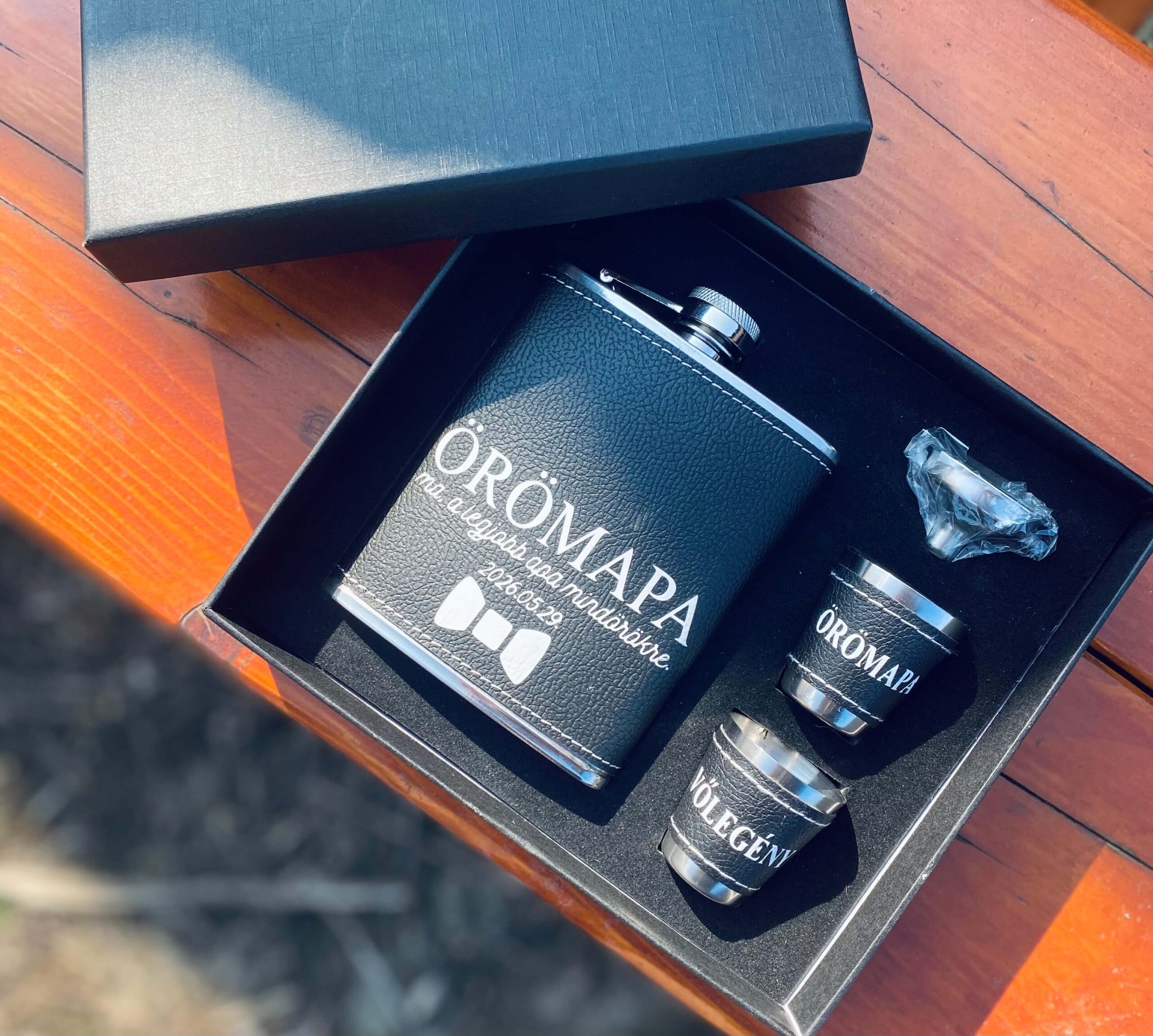 Lepd meg az örömapákat egy igazán különleges ajándékkal! Ez az elegáns laposüveg szett tökéletes választás az esküvő napjára, hogy méltó módon mondjatok köszönetet a támogatásukért és szeretetükért.