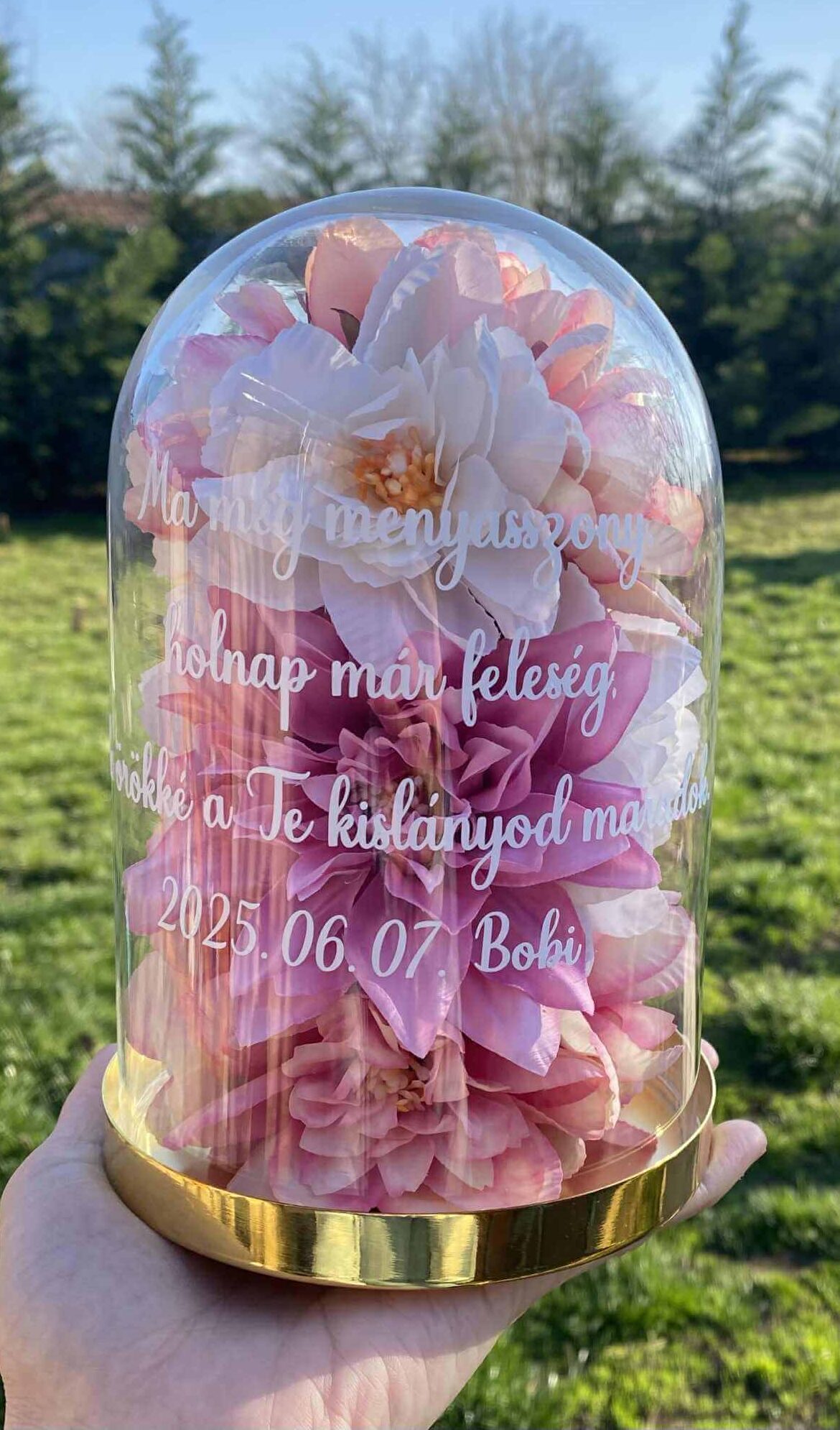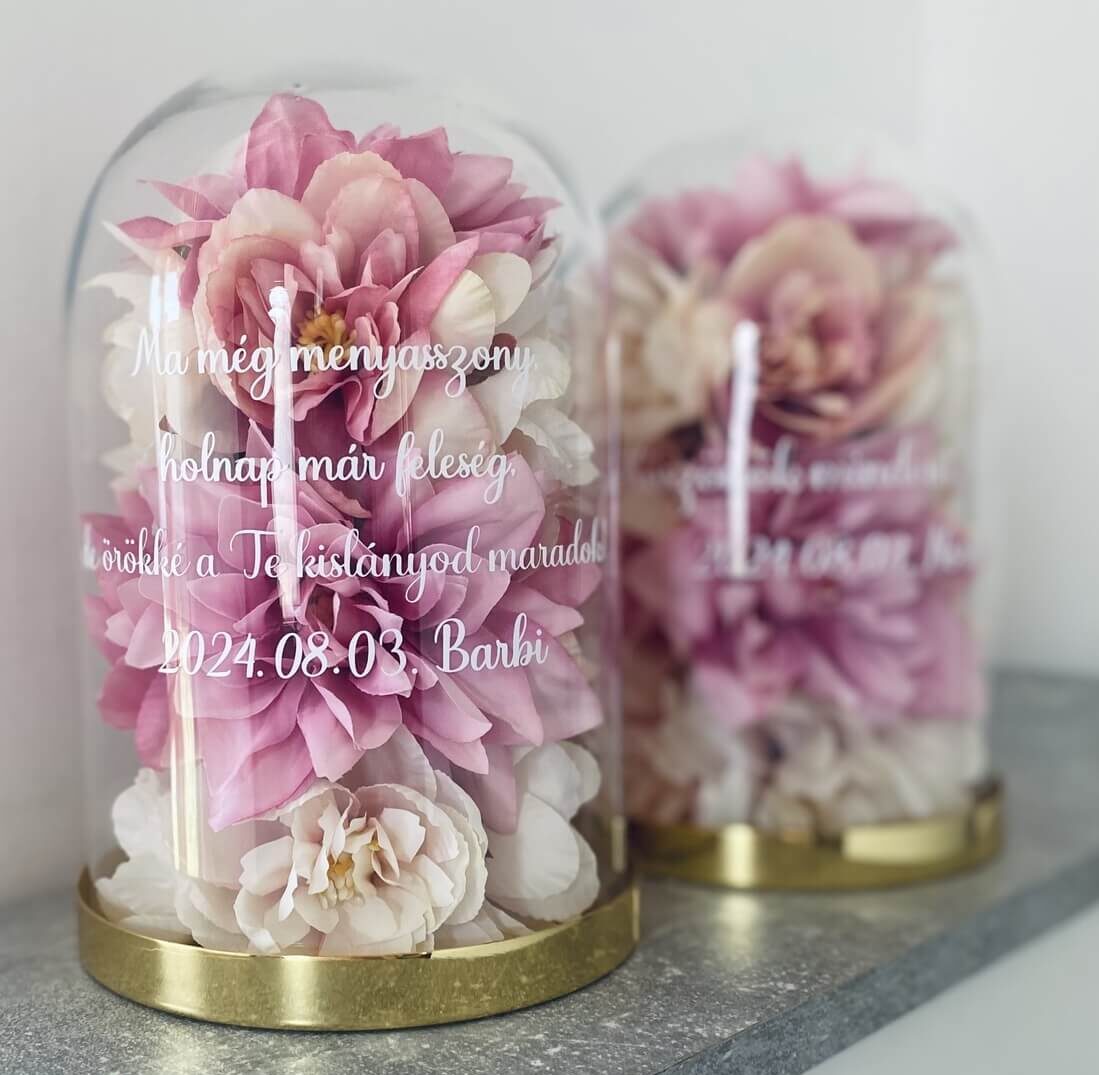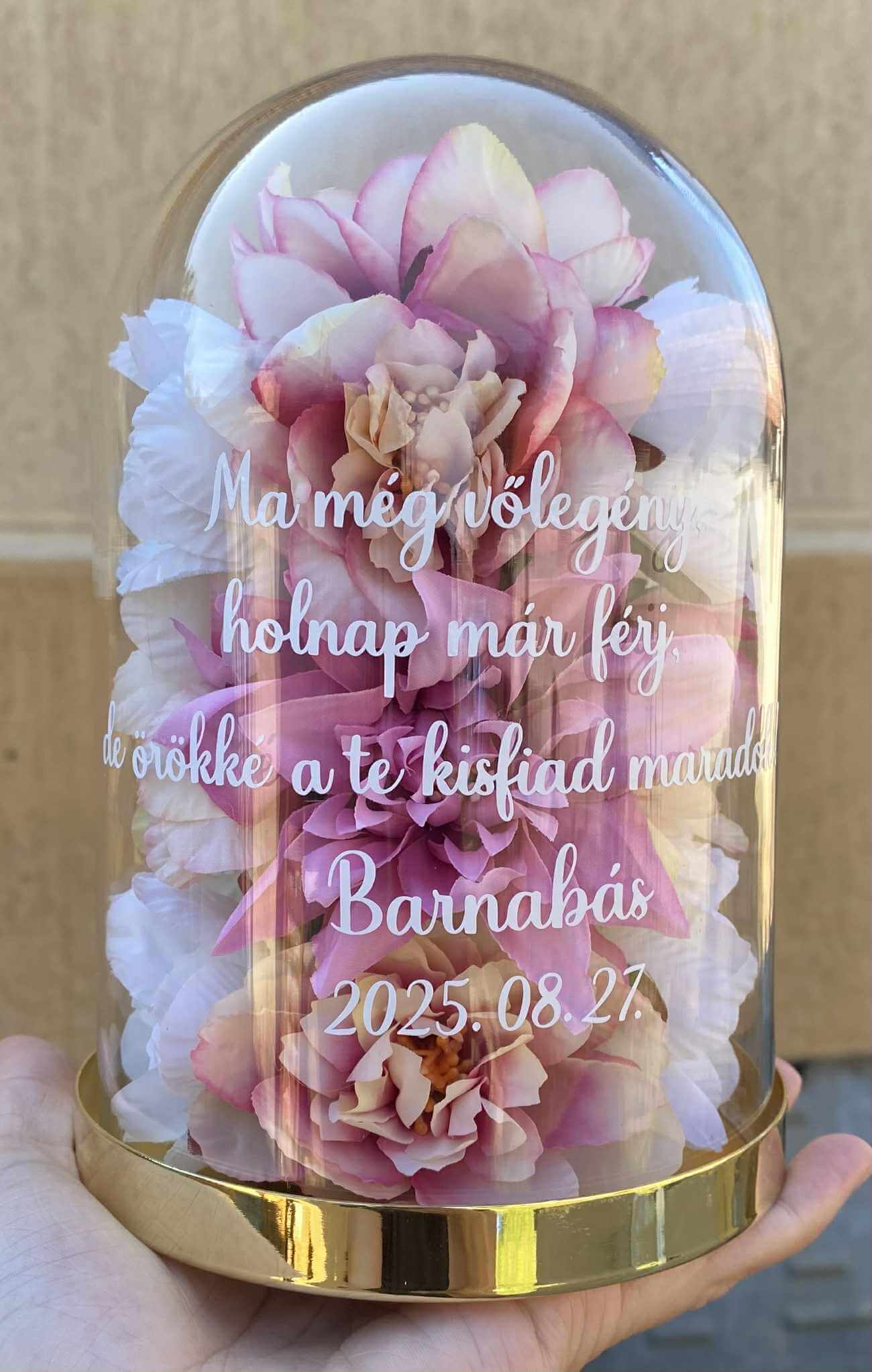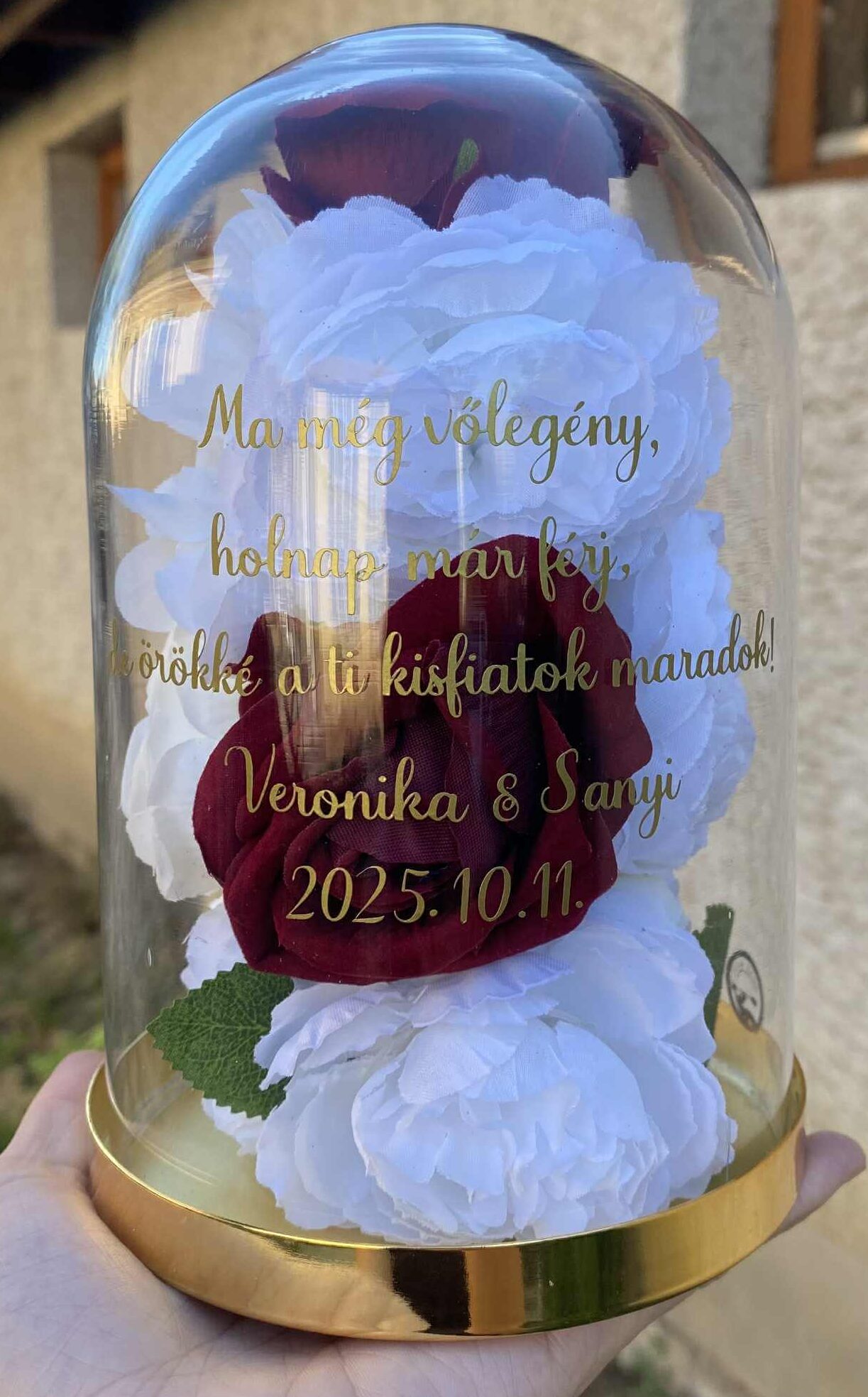 Gyönyörű, selyemvirágokkal díszített üvegbúra alkalomhoz illő felirattal