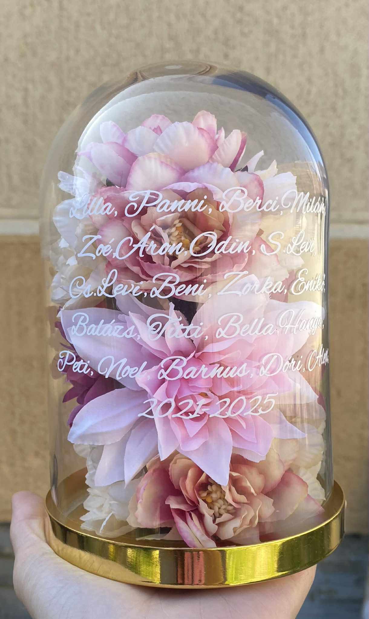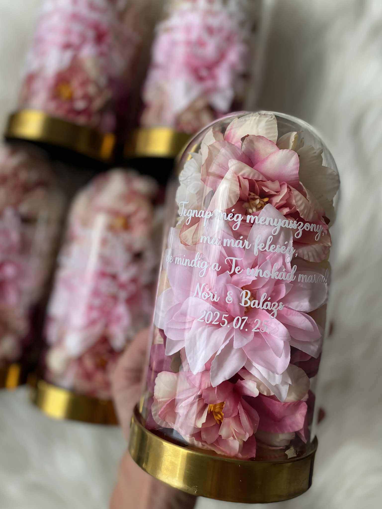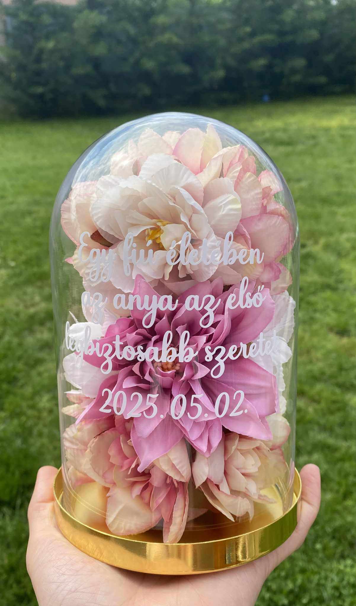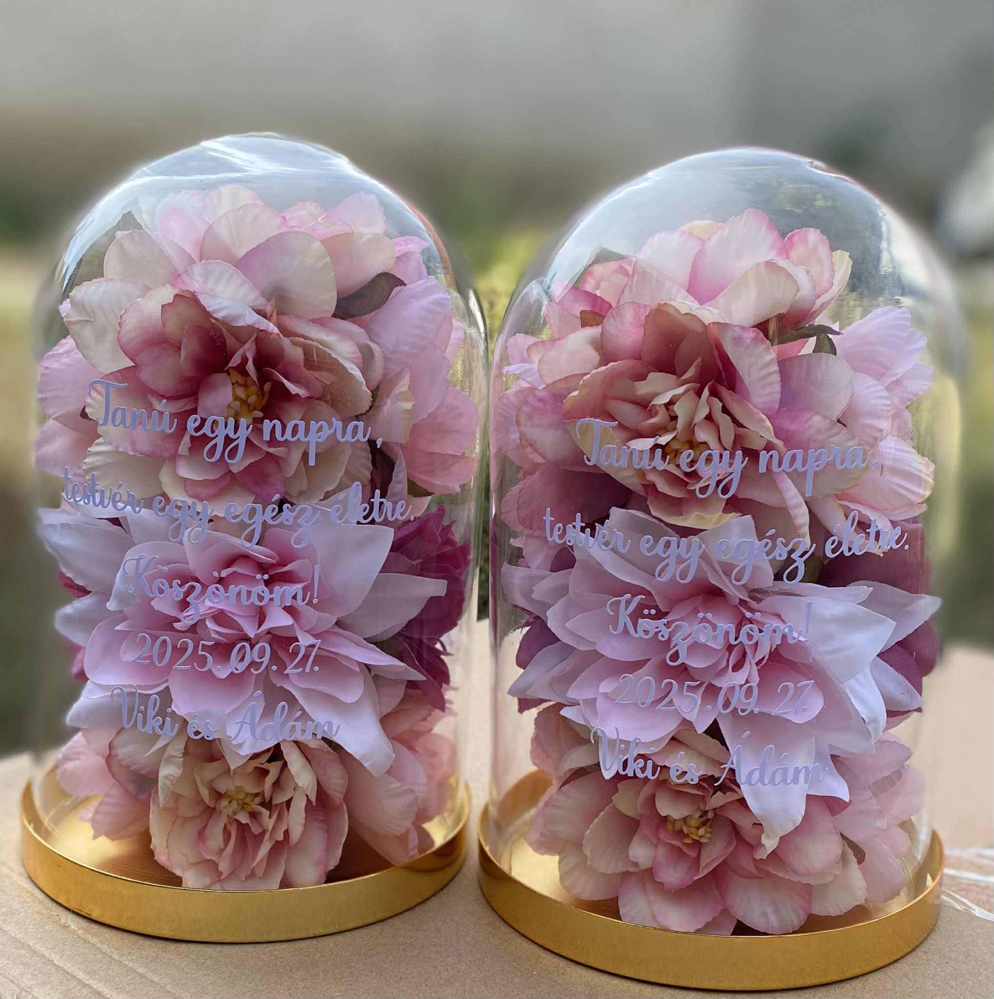 Gyönyörű, selyemvirágokkal díszített üvegbúra alkalomhoz illő felirattal